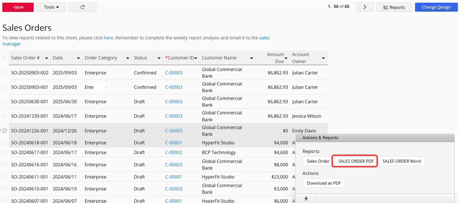 You can export records into custom PDF, Word, or PNG formats in Ragic. For example, export "Sales Orders" into the PDF format your company usually uses.