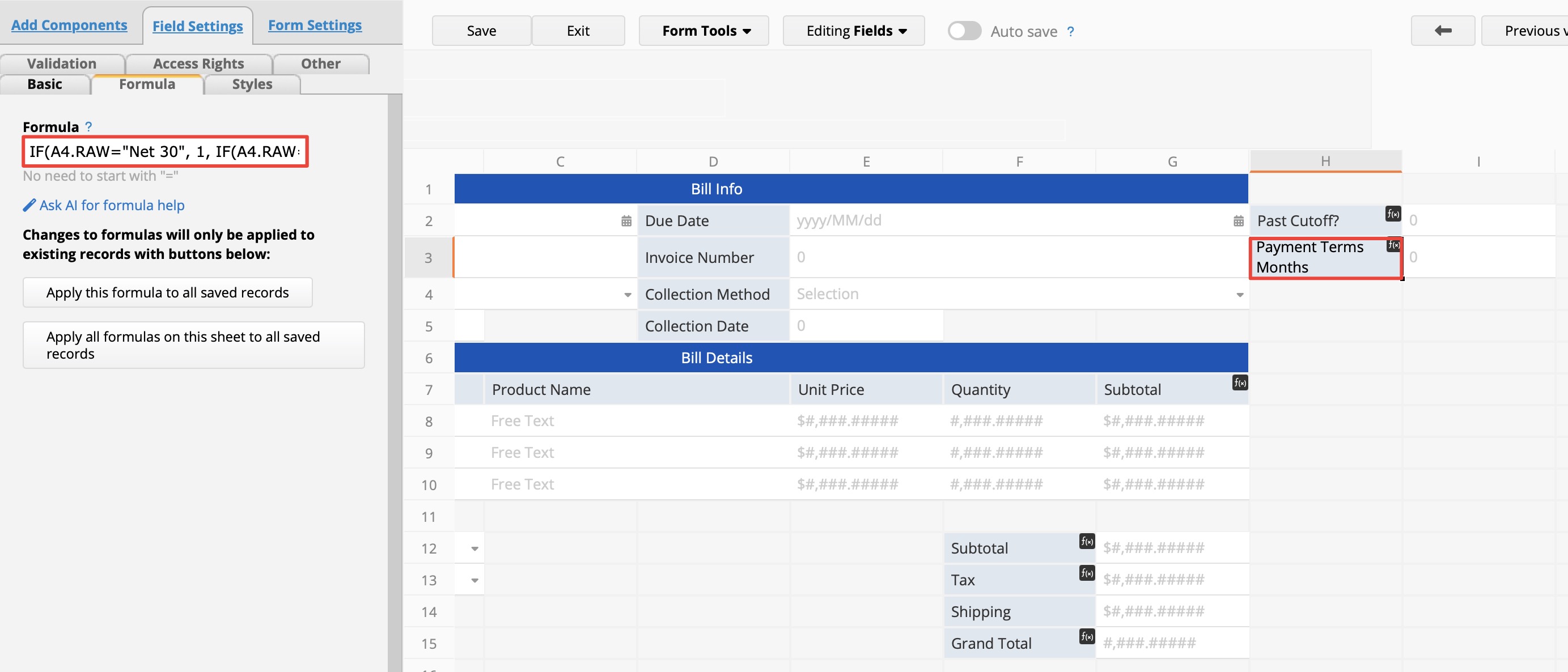 If the company's cutoff date is not the 25th of each month and the collection date is not at the end of the month, you can also set the cutoff date and collection date in separate fields. Then add some fields for the system to determine the number of months that should be added to the invoice date under each condition and calculate the payment due date. The conditions are as follows: