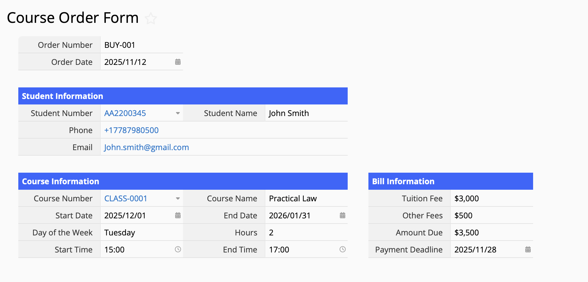 In the context of sending payment notifications, for example, you might have a "Course Order Form" like this that keeps track of which students are buying which courses, as well as calculating the total amount and payment deadline for these courses.