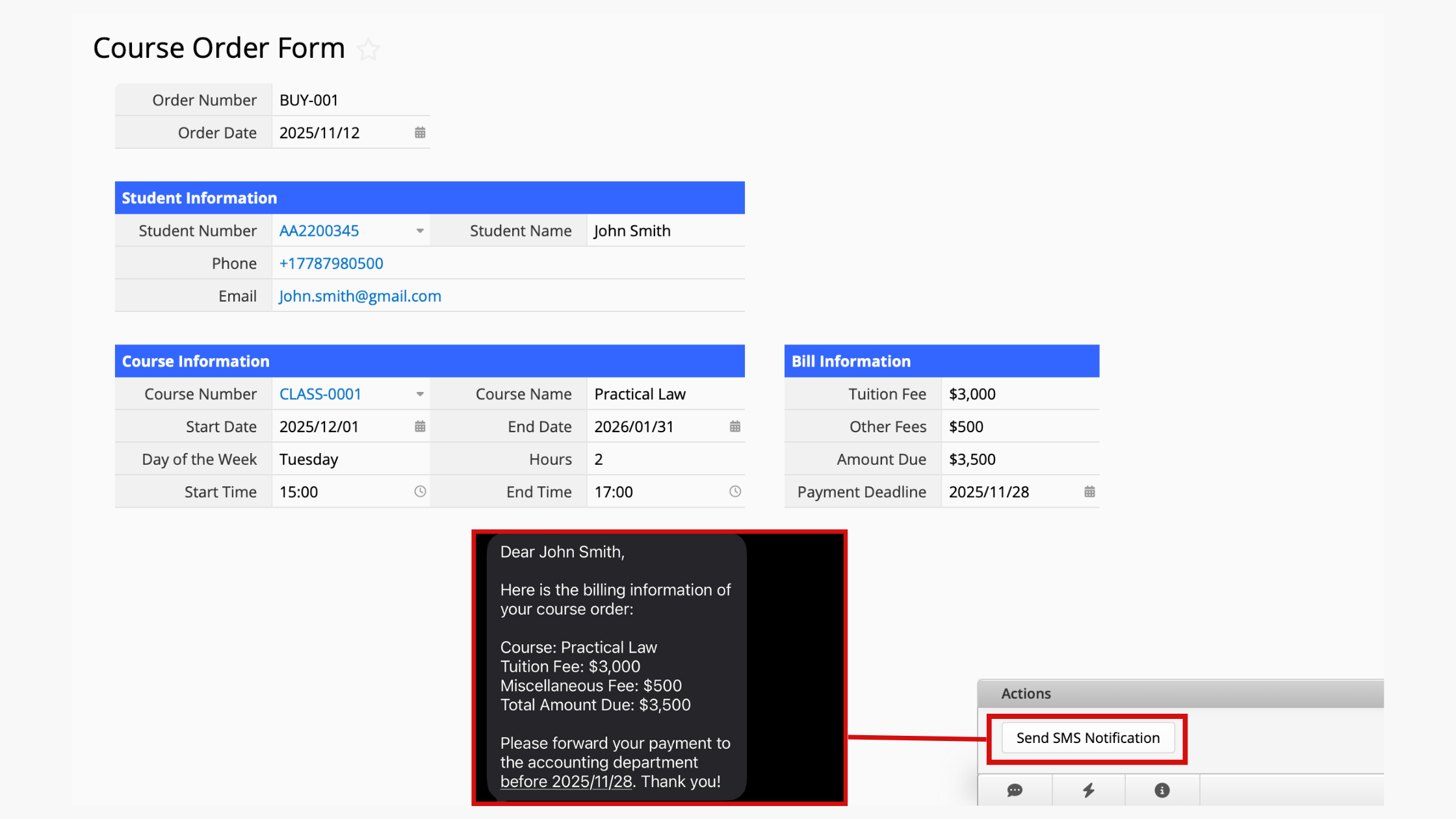 This record should be sent to "John Smith," which includes course order information for "Practical Law," with a tuition fee of $3,000 and miscellaneous fee of $500, totaling $3,500. The payment should be completed by November 28, 2025.