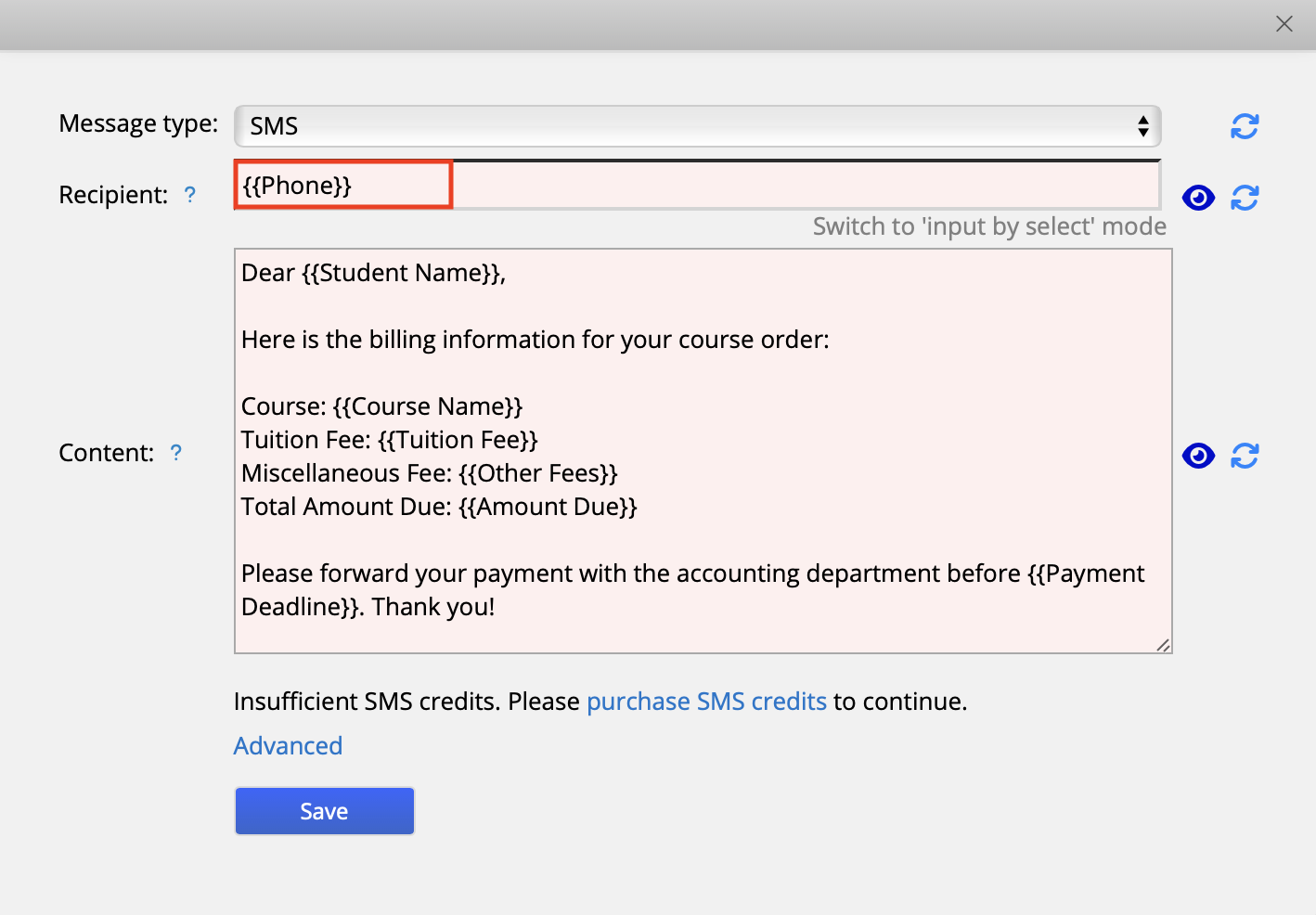 Next, create an instant message button in your Course Order Form (payment slip)! Select "SMS" as the message type.