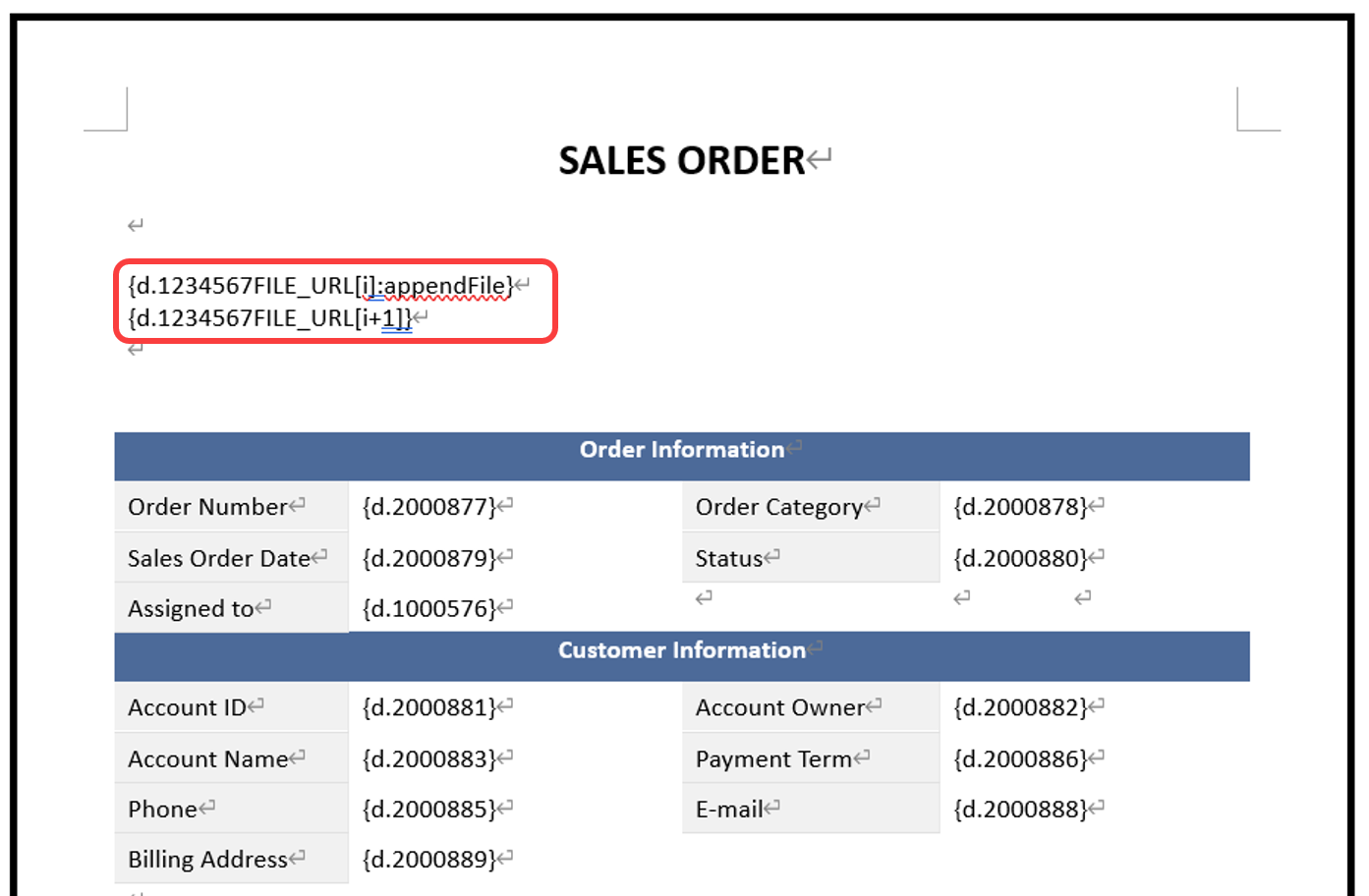 Add the following parameters at any position in the template:{d.1234567FILE_URL[i]:appendFile(start)}