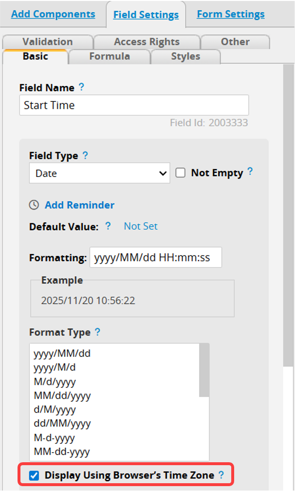 If users in different time zones need to work with the Reservation System, enable "Display Using Browser’s Time Zone" in the "Start Time" and "End Time" fields of the source sheet. The Reservation times on the Reservation sheet will then automatically convert to the user’s browser time zone.