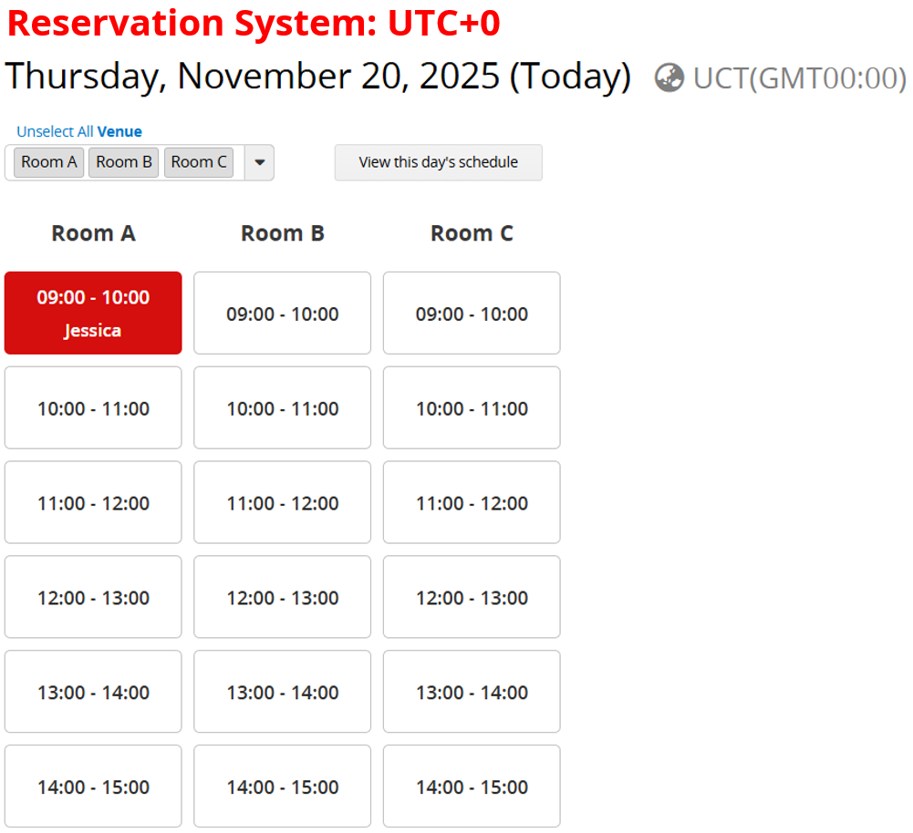 The time slots available in the Reservation System follow the company’s configured time zone. This means that both the available Reservation time slots shown in the report and the final saved Reservation records are calculated and displayed according to the company’s time zone.