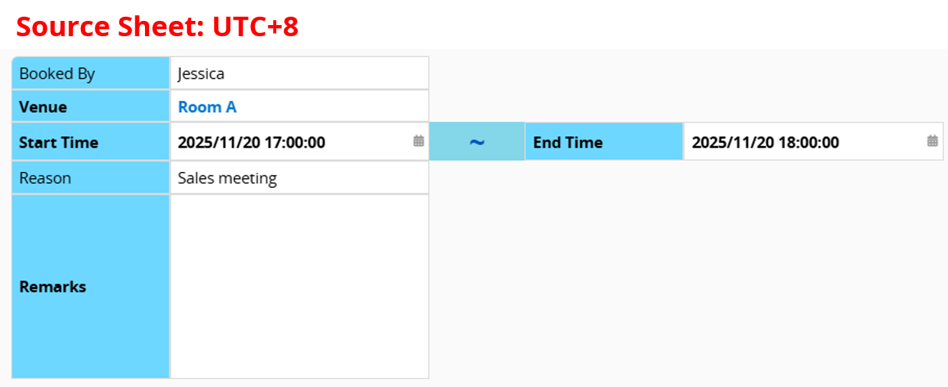 The company time zone is set to UTC+0, and the user is in Taipei (UTC+8). If the user books the time slot 11/20 9:00 to 10:00 in the Reservation System report and then views it on the source sheet, the system will automatically convert the time according to the browser time zone and display it as 11/20 17:00 to 18:00.