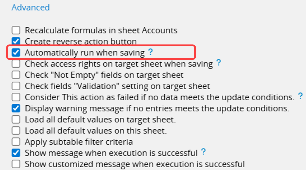 Use Case: In an "Equipment Checkout" sheet, set the "Checkout" button to Automatically run when saving. This ensures the equipment status is updated immediately, preventing situations where items appear available even though they are checked out.
