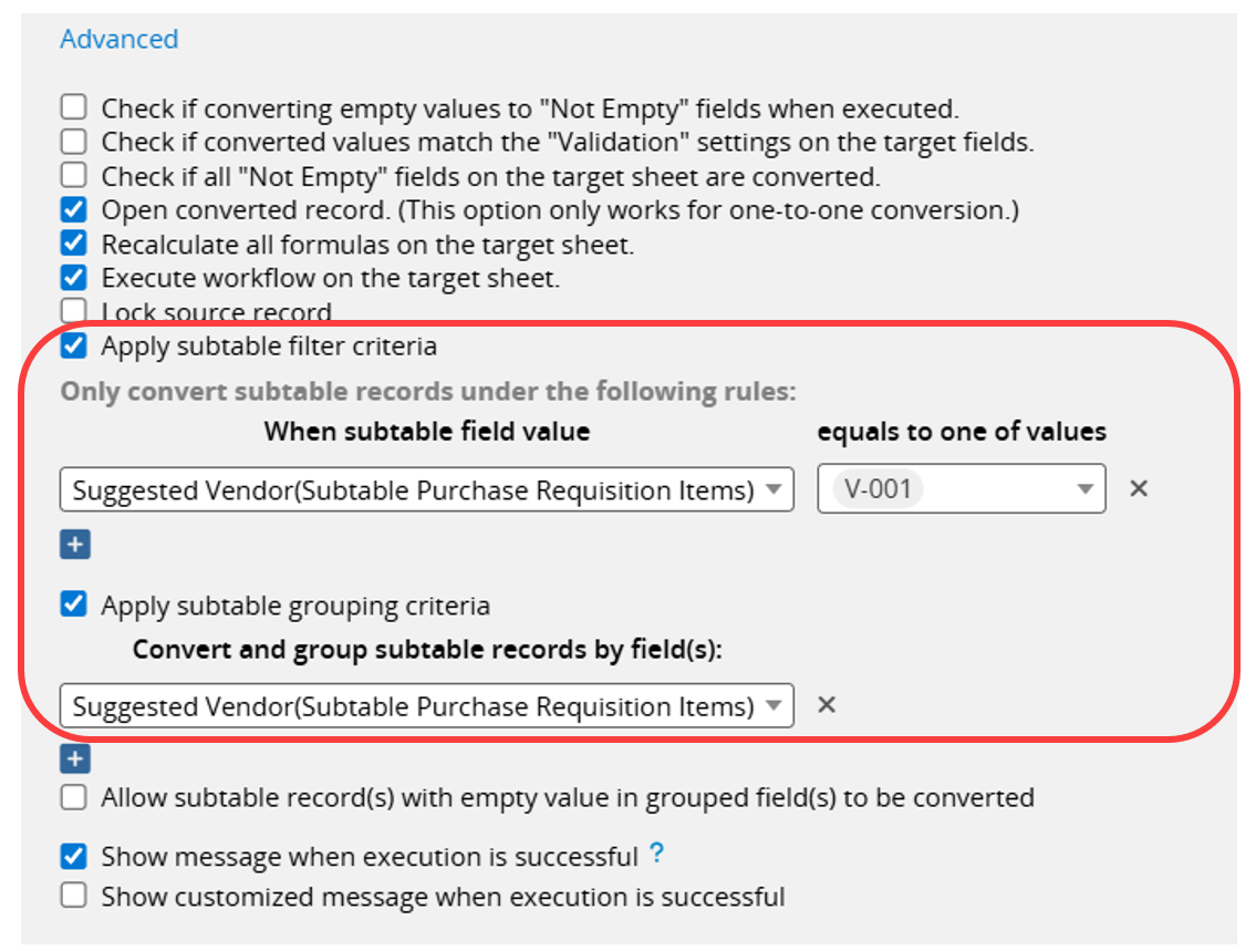 By default, the Convert Records Action Button copies all Subtable rows into the destination sheet. However, there are cases where users may want to convert only specific rows or create multiple entries based on a particular field. This can be done using the Apply Subtable Filtering Criteria and Apply Subtable Grouping Criteria options in Advanced Settings.