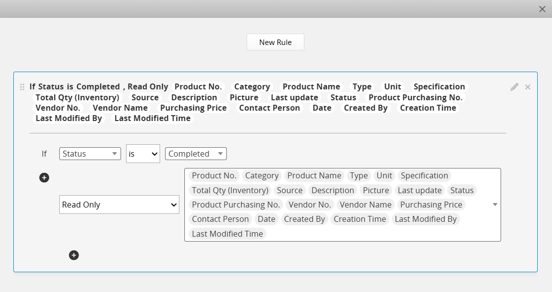 While Ragic supports adding a Lock Record action as a button, it still relies on manual user execution. In addition, it cannot be easily combined with other action buttons or triggered by specific conditions. An effective alternative is to use Conditional Formatting. You can configure a rule so that when specific conditions are met, all fields automatically become read-only.