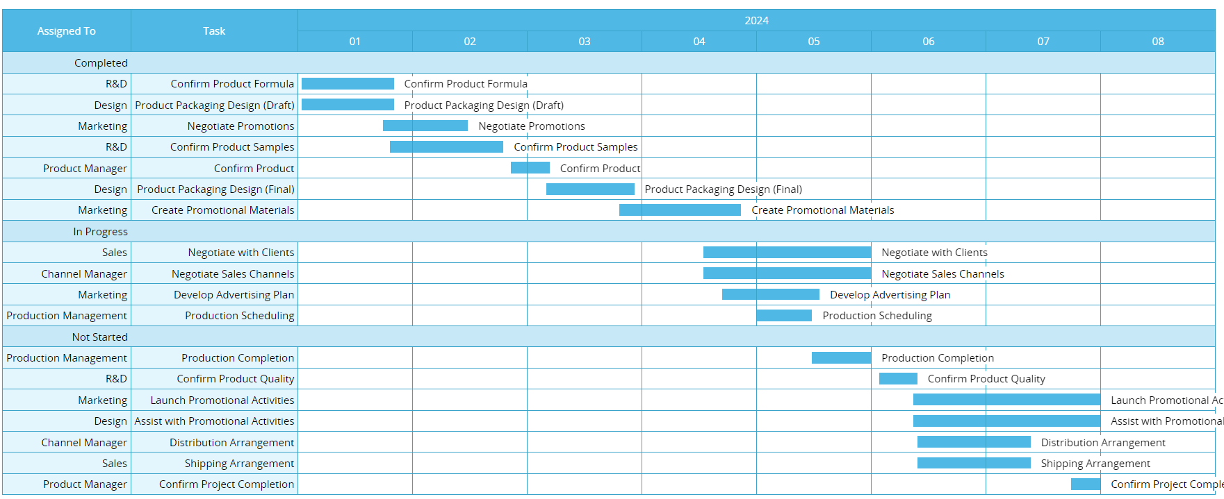 A Gantt Chart is a common project management tool that helps visualize project timelines. It’s useful for tasks such as new product planning, event preparation, and marketing campaign scheduling. You can generate a Gantt Chart whenever your sheet includes the Start and End Date fields.