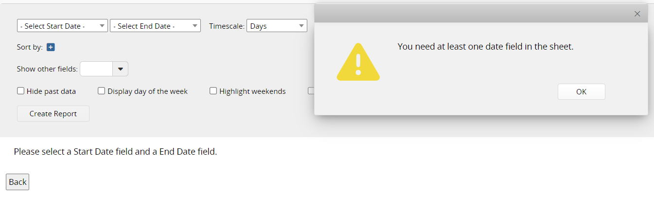 If there are no Date fields in the sheet, a warning message will appear when creating the report.