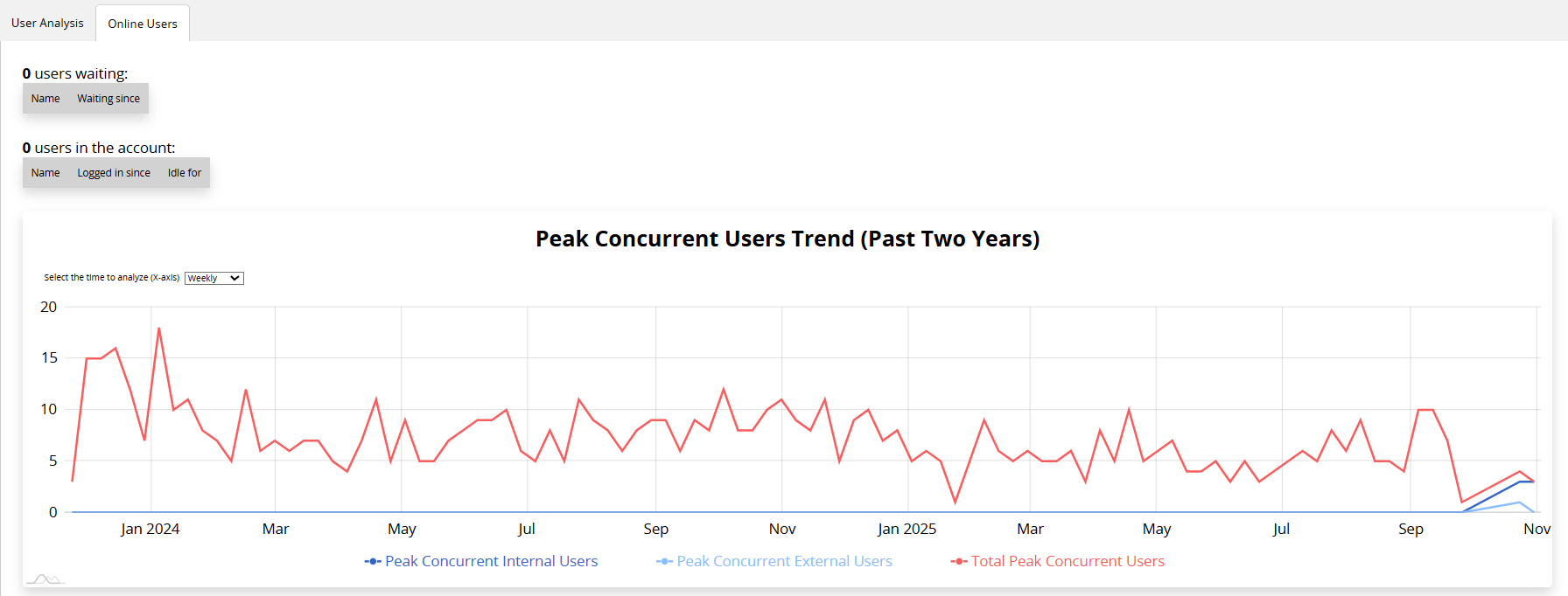 You can view the number of users who are currently waiting or active, as well as the peak concurrent users trend (past two years).