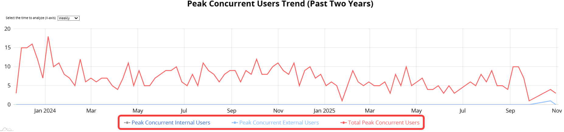 In the Peak Concurrent Users Trend (Past Two Years) chart, you can view the number of peak concurrent users for Internal Users, External Users, or all users separately.