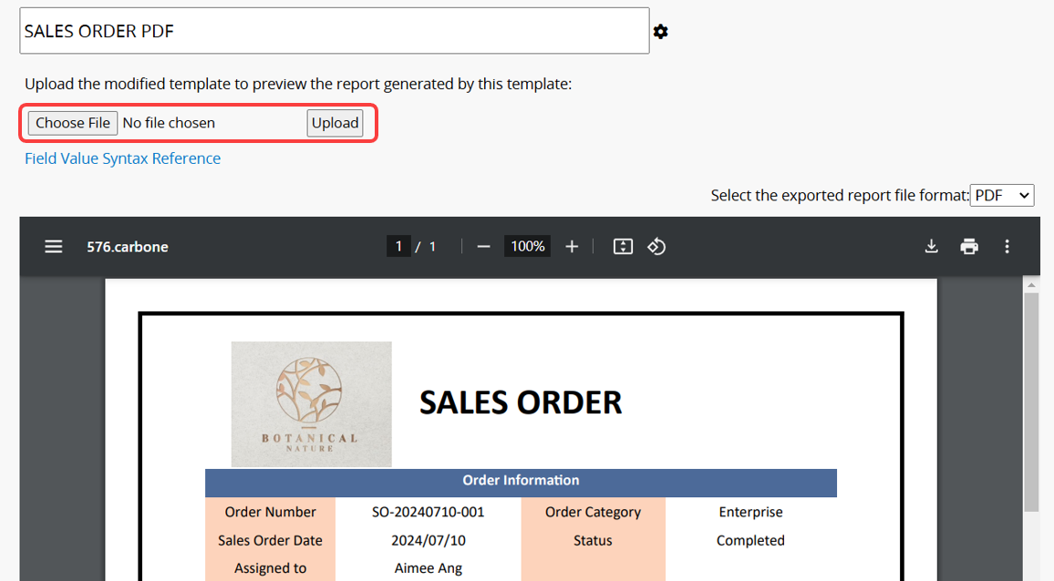 You can export records into custom PDF, Word, or PNG formats in Ragic. For example, export "Sales Orders" into the PDF format your company usually uses.