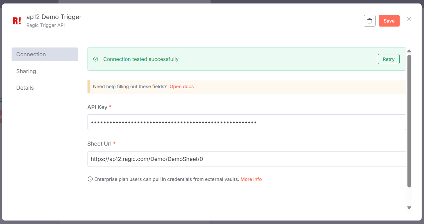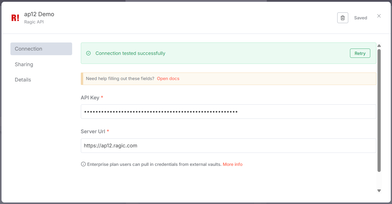 When using for the first time, you need to create a new Credential. In the “Credential to connect with” dropdown, select Create new Credential, and configure the API Key and Server Url (e.g. https://www.ragic.com, https://ap12.ragic.com), then save.