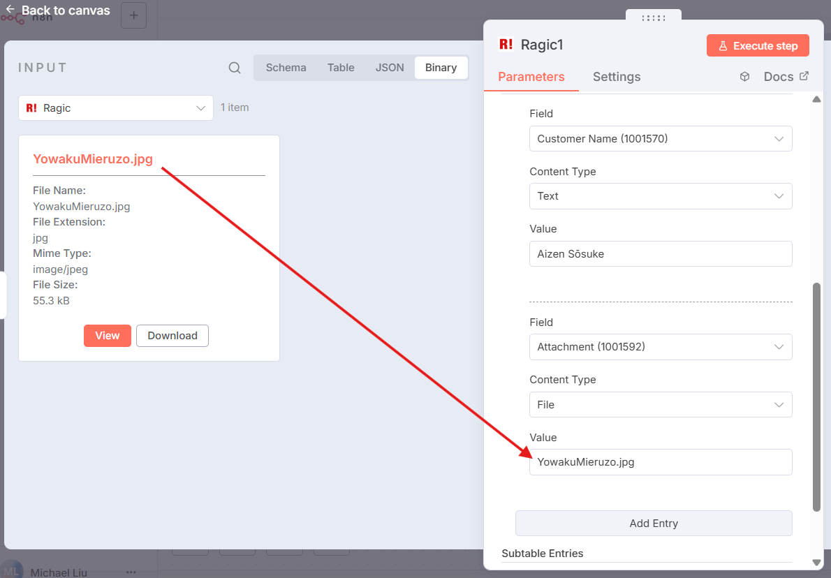 Finally, enter the file name in "File Name". Note: this is not the display name in the form, but the unique file name stored in the Ragic database (e.g. Ni92W2luv@My_Picture.jpg), which you can get via Ragic HTTP API (or via n8n Ragic Node Read Data Action).
