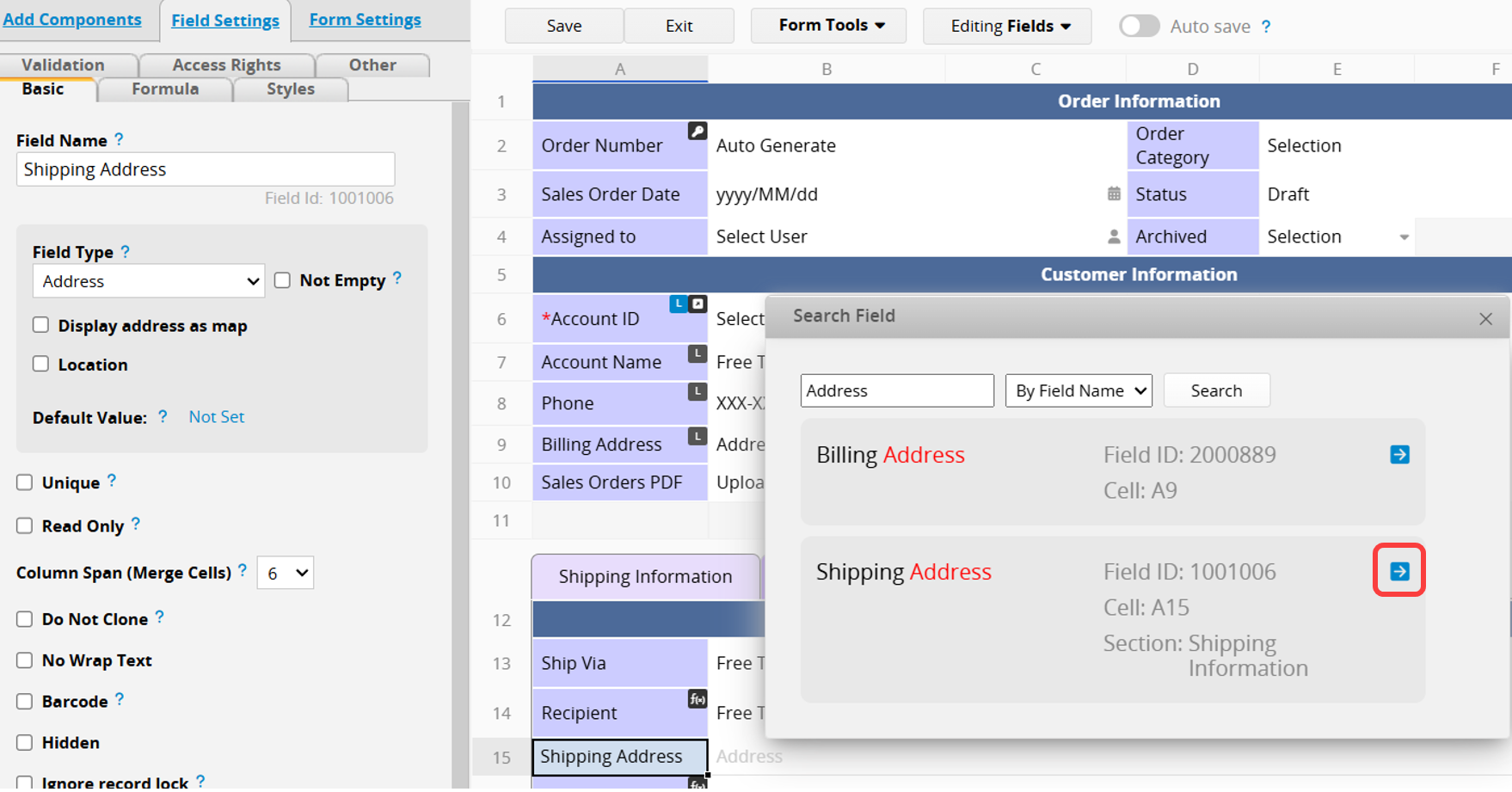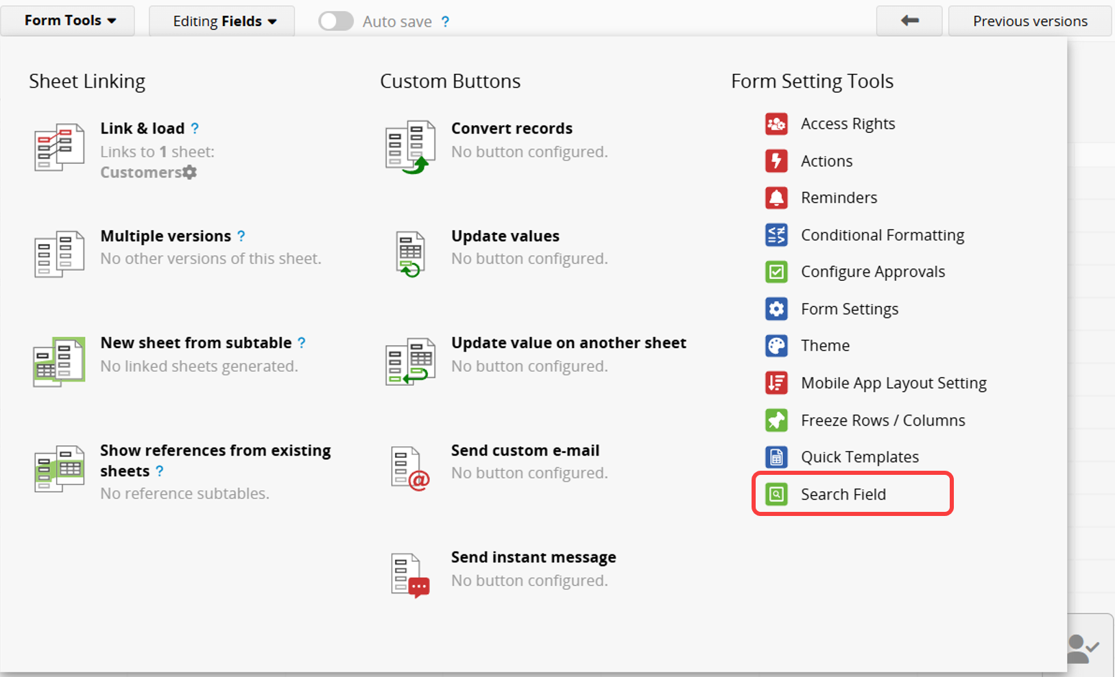 1. Click Search Field under Form Settings Tools in the Form Tools.