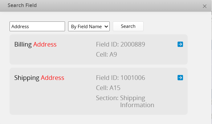 After entering a keyword and clicking "Search", all matching fields will be listed below, including their field name, field ID, and cell position (for example, B17). If a field is located within a Sheet Section, the section name will also be shown.