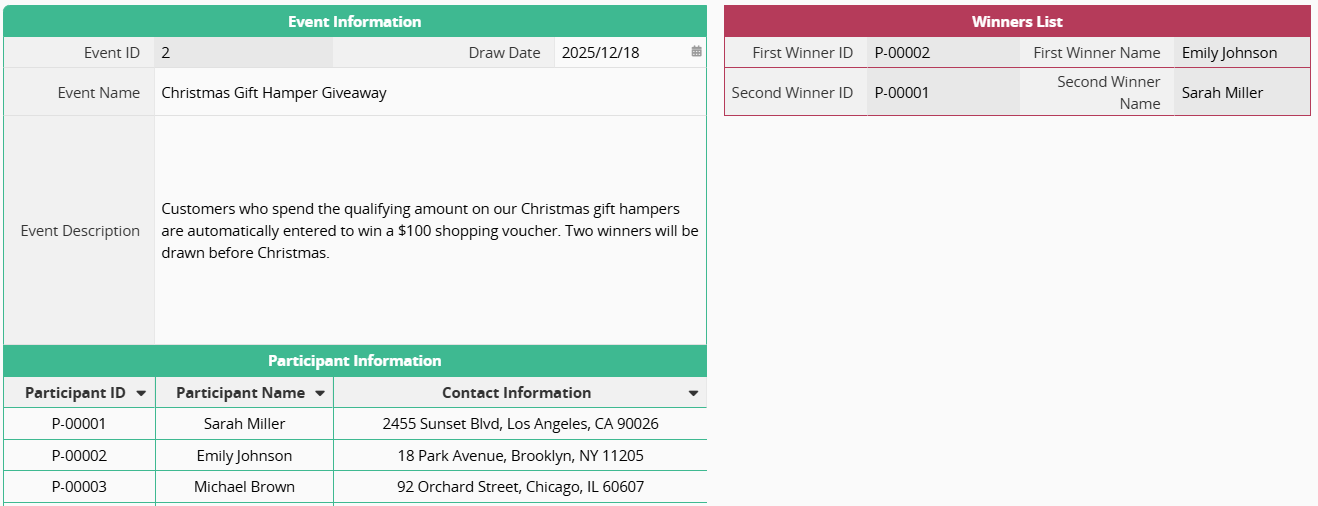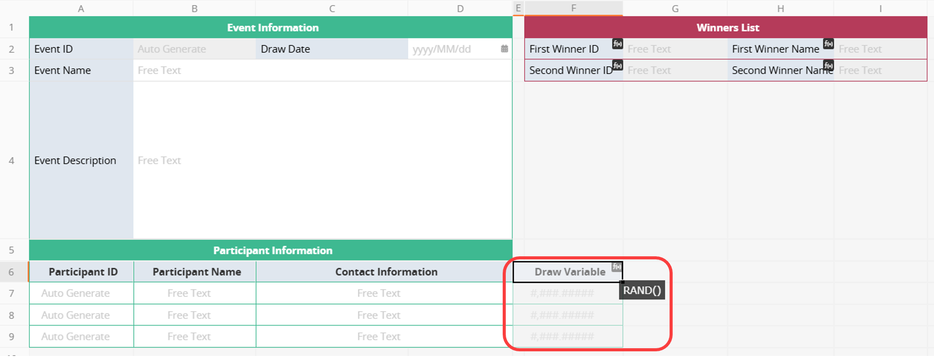 1. In the "Draw" sheet, add a "Participants" Subtable. Besides participant details, create a "Draw Variable" field with the formula RAND(). The system will automatically generate a random value between 0 and 1 for each Subtable record.