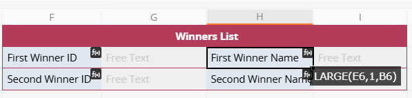 2. Create a "Winners List" field and apply a formula that sorts by the "Draw Variable". To select one winner, enter the formula LARGE("Draw Variable", 1, "Participant Name") to return the participant name corresponding to the top-ranked record. To select multiple winners, create additional "Winners List" fields to retrieve the top few records accordingly.