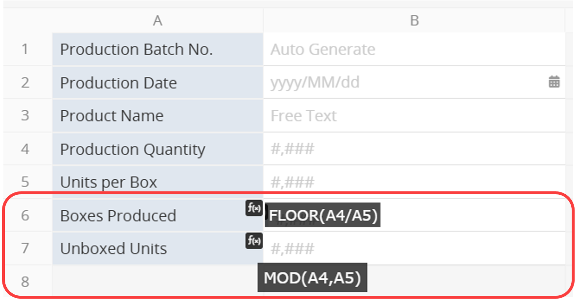 Then, use MOD("Total Production Quantity", "Units per Box") in the "Unboxed Units" field to find the remaining units that do not fill a complete box.