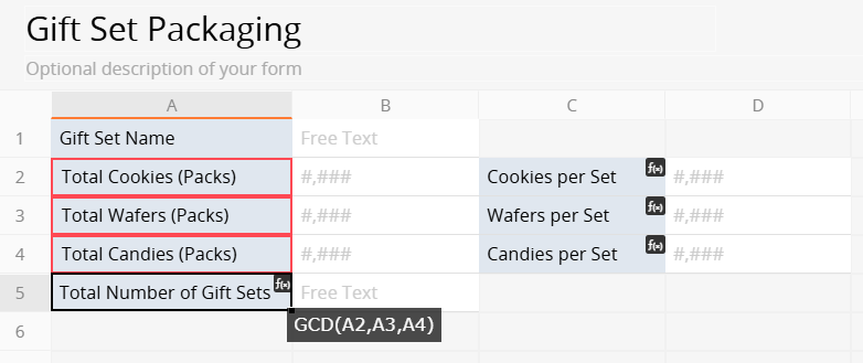 In the "Gift Set Packaging" sheet, apply the formula GCD(A2, A3, A4) in the "Total Number of Gift Sets" field to calculate how many complete gift sets can be assembled from three products: cookies, wafers, and candies. A2, A3, and A4 represent the quantity fields for each product.