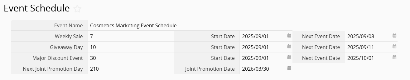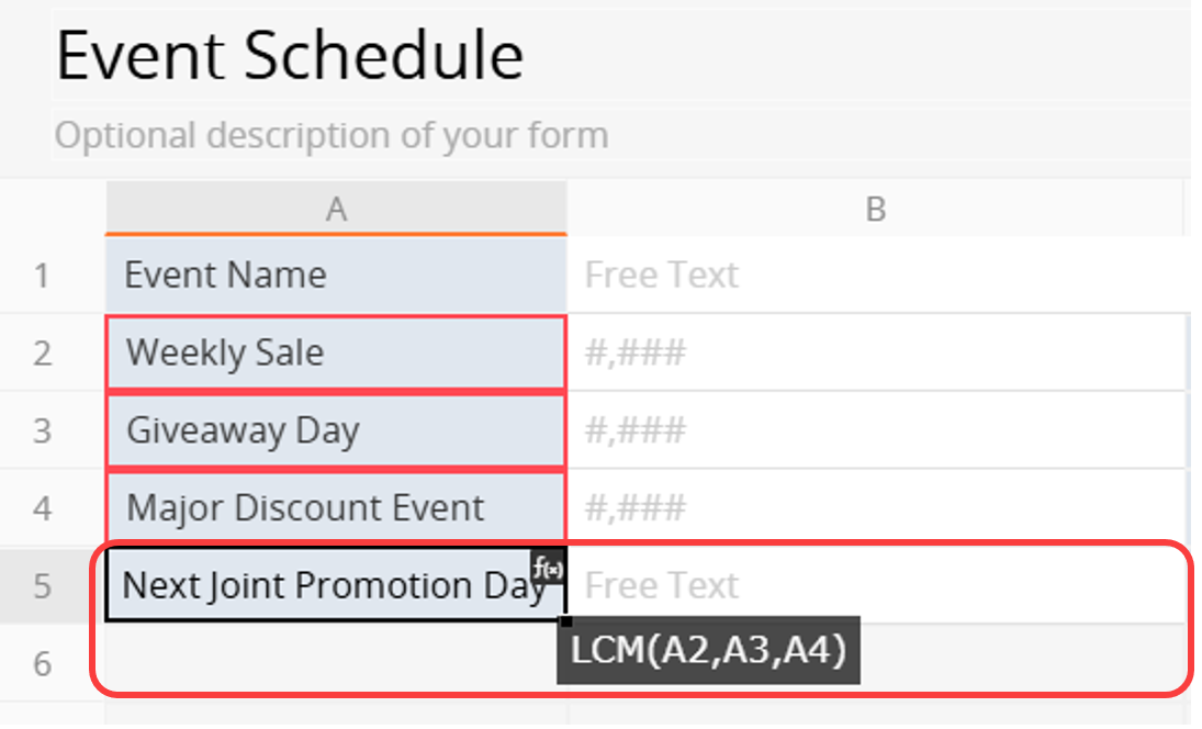 Suppose a company runs three recurring promotions: a weekly sale every 7 days, a giveaway every 10 days, and a major discount event every 30 days. In the "Next Joint Promotion Day" field, enter the formula LCM(A2, A3, A4), where A2, A3, and A4 represent the event cycle fields. The system will return a least common multiple of 210.