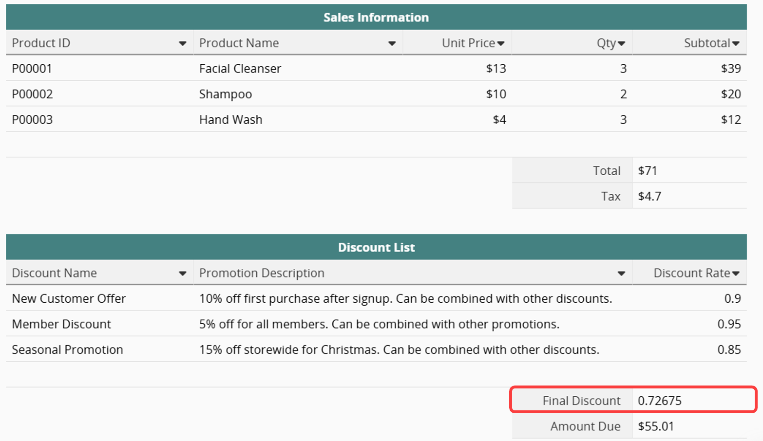 If an order qualifies for multiple discounts listed in the "Discount List" subtable, create a field named "Final Discount" and apply the formula PRODUCT("Discount Rate"). The system will automatically multiply all discount rates to calculate the total cumulative discount for the order.
