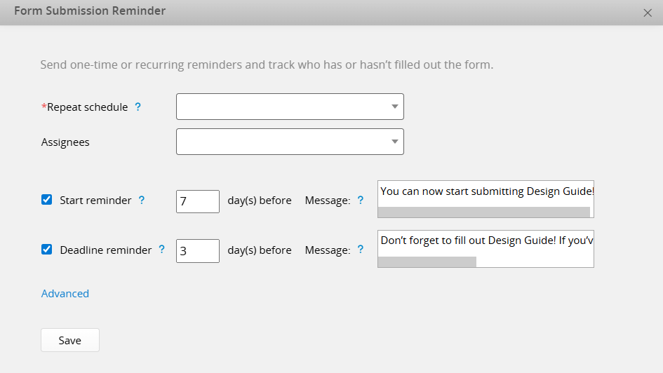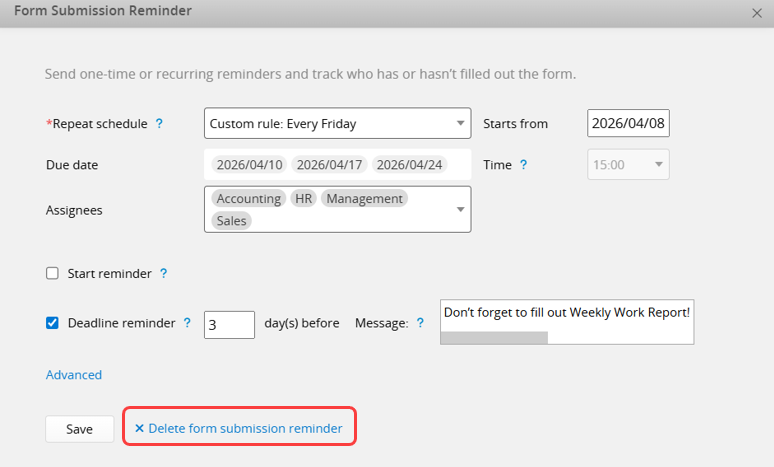 To delete a saved form submission reminder, click Delete form submission reminder next to the Save button. This will remove the reminder settings, historical submission records, and related schedules.