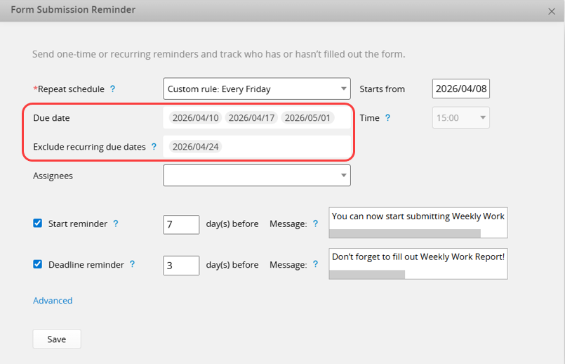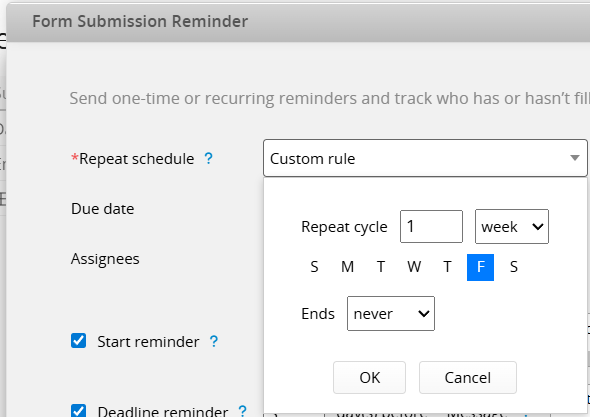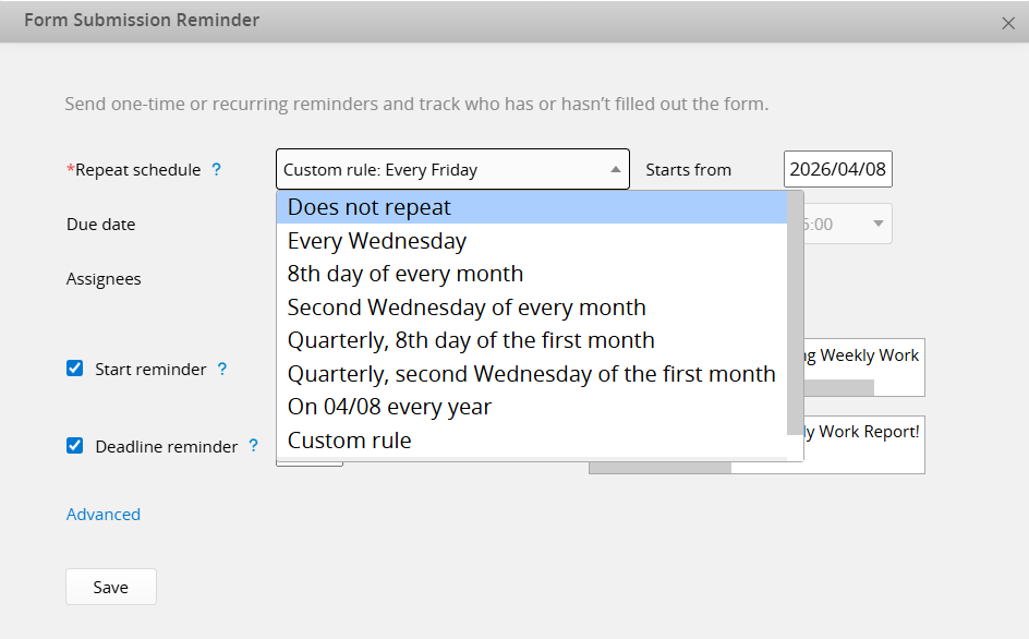 When creating a Custom rule, you can define the repeat cycle, select specific weekdays, and choose how the recurrence ends. For example, you can set a reminder to submit a "Weekly Work Report" every Friday.