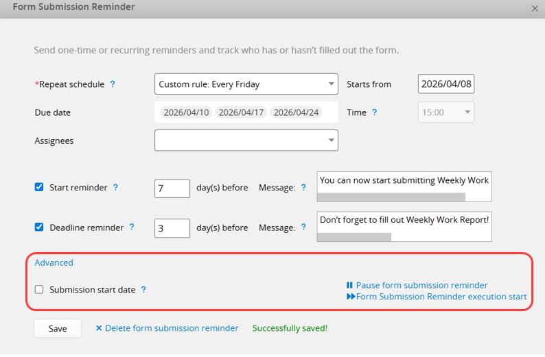 After saving the reminder, open Advanced to pause the reminder or start the Form Submission Reminder.