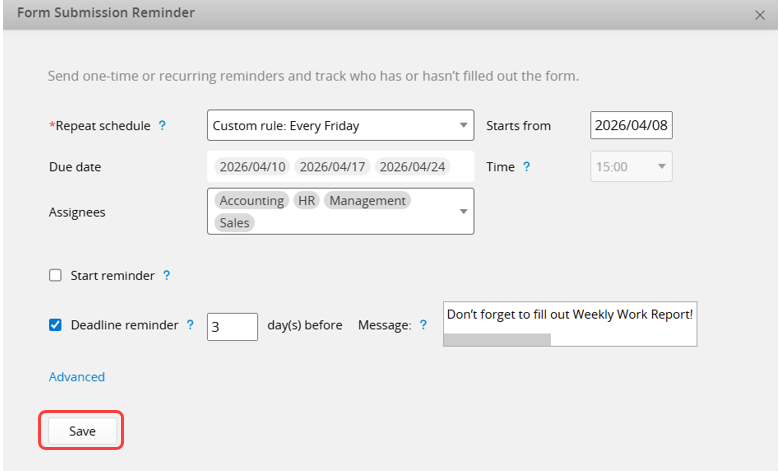 You can set up the Form Submission Reminder to prompt users to complete a sheet regularly or as a one-time task, such as quarterly objectives, weekly work reports, or event registration forms. The system automatically sends reminders based on the configured due dates and repeat schedules, and tracks each user’s submission status.