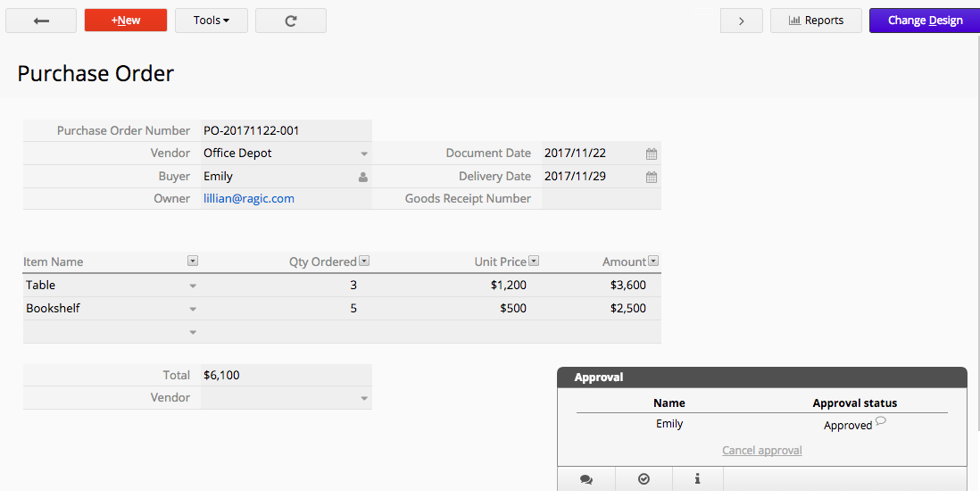 If you want to include the approval records from a "Purchase Order" in the Mail Merge, the original sheet design is as follows: