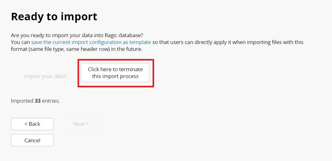 If you would like to terminate the current import process, you can click Terminate import process in the import interface.