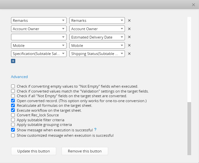 The use case is slightly different. If the Subtable has N rows of data, clicking the button once will create N records in the target sheet. For example, there is a "Quotation" sheet and another "Product Quotation Details" sheet. You want to convert values from the Subtable in the "Quotation" sheet to independent fields in the "Product Quotation Details" sheet.
