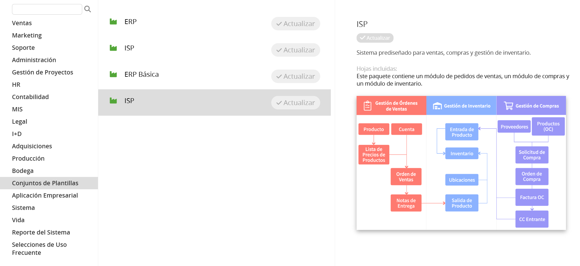 La plantilla de Gestión de Órdenes de Ventas, Compras, y Gestión de Inventario. Si sólo necesitas las funciones de una de ellas, puedes instalarlas independientemente.