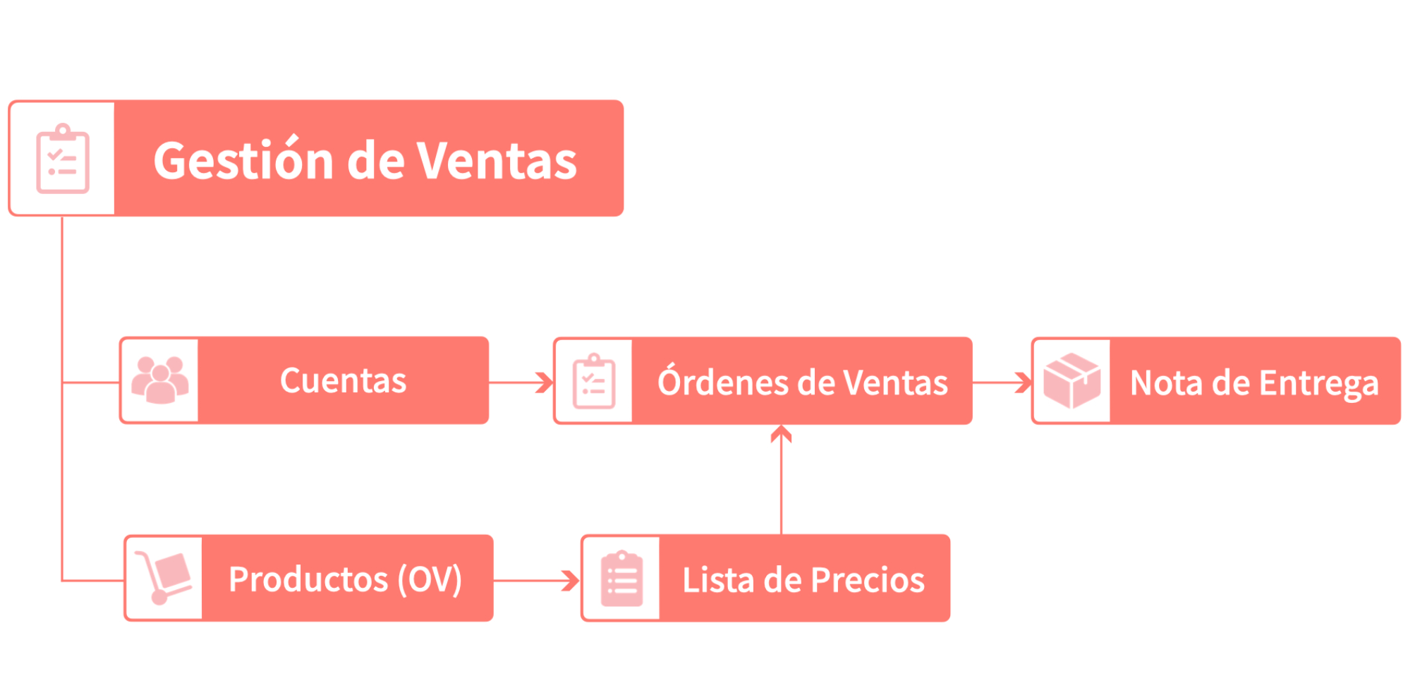 Productos (OV) y Lista de Precio →(Cuentas) → Orden de Ventas → Nota de Entrega → (Stock Out)