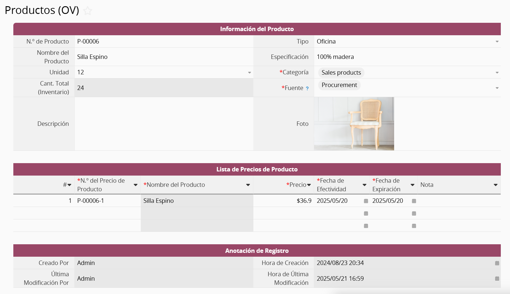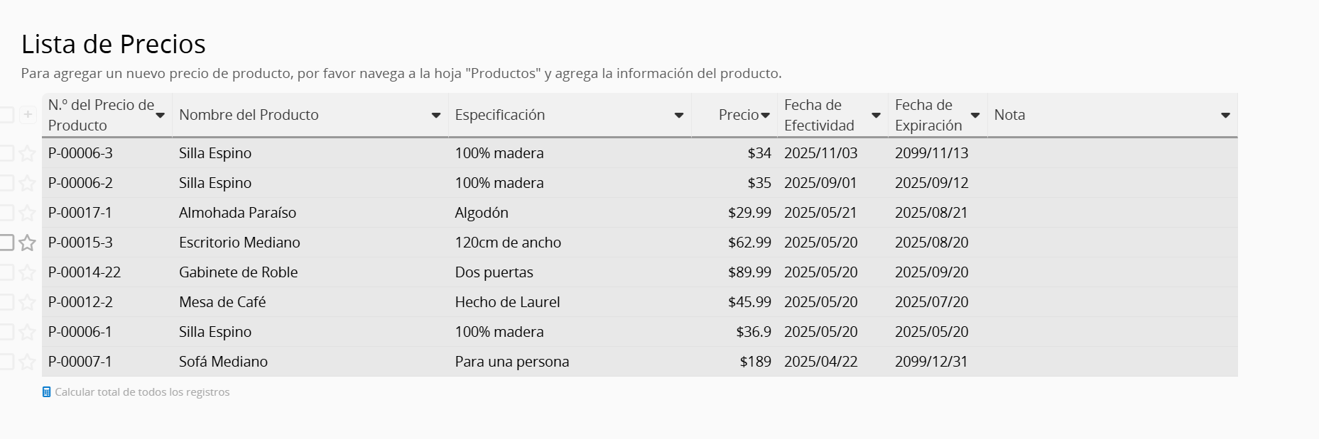 La hoja está generada desde la subtabla Lista de precios de productos de la hoja Productos (OV). Actualmente, todos los campos son de sólo lectura asique los valores no pueden ser modificados. Para agregar o modificar los datos de precios de productos, por favor hazlo desde la subtabla en la hoja Productos (OV).