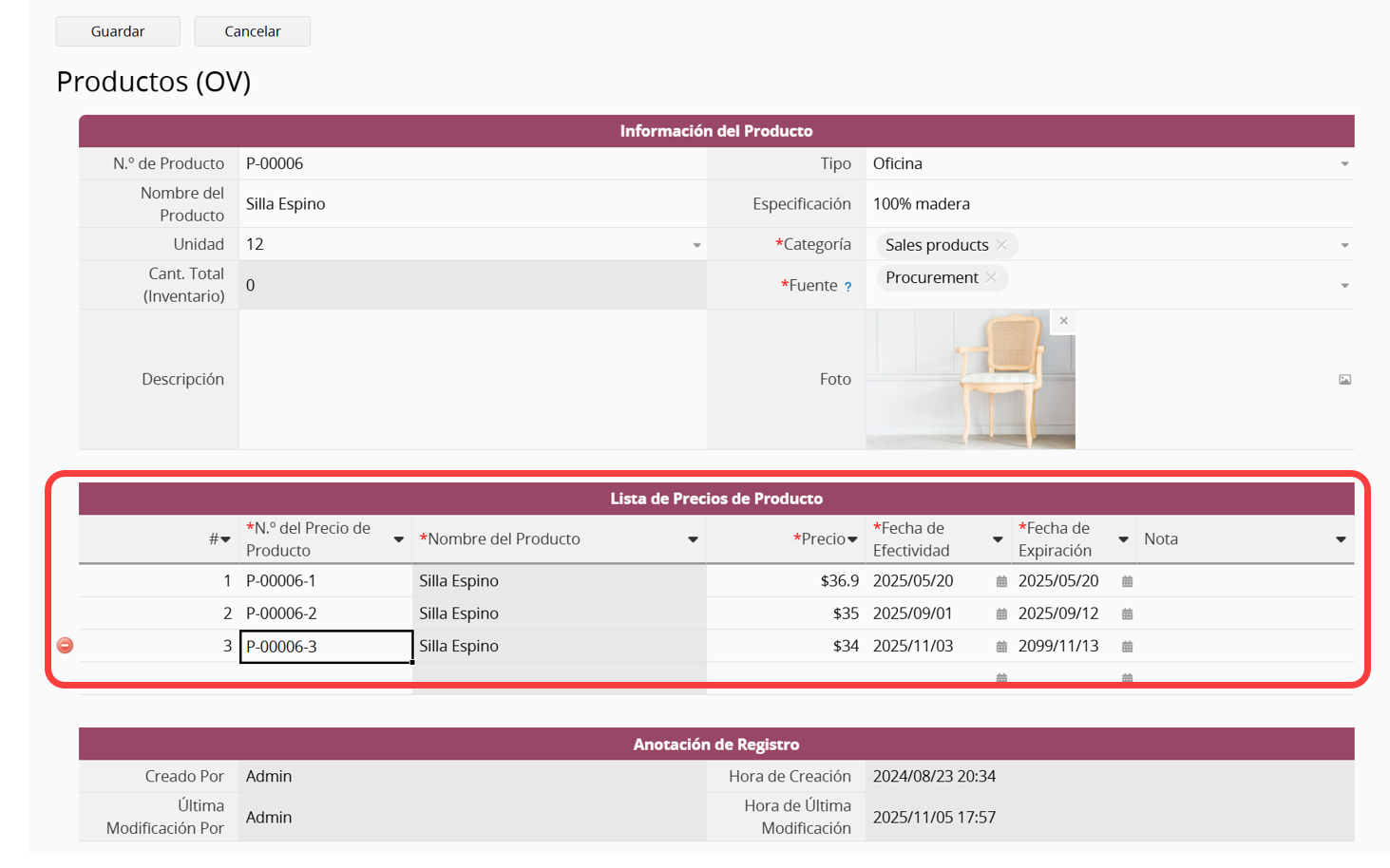 El valor actual de No. Precio de Producto es “No. de Producto -Precio#”. El valor del campo es automáticamente rellenado por fórmula y este es el valor único de la lista de precios.