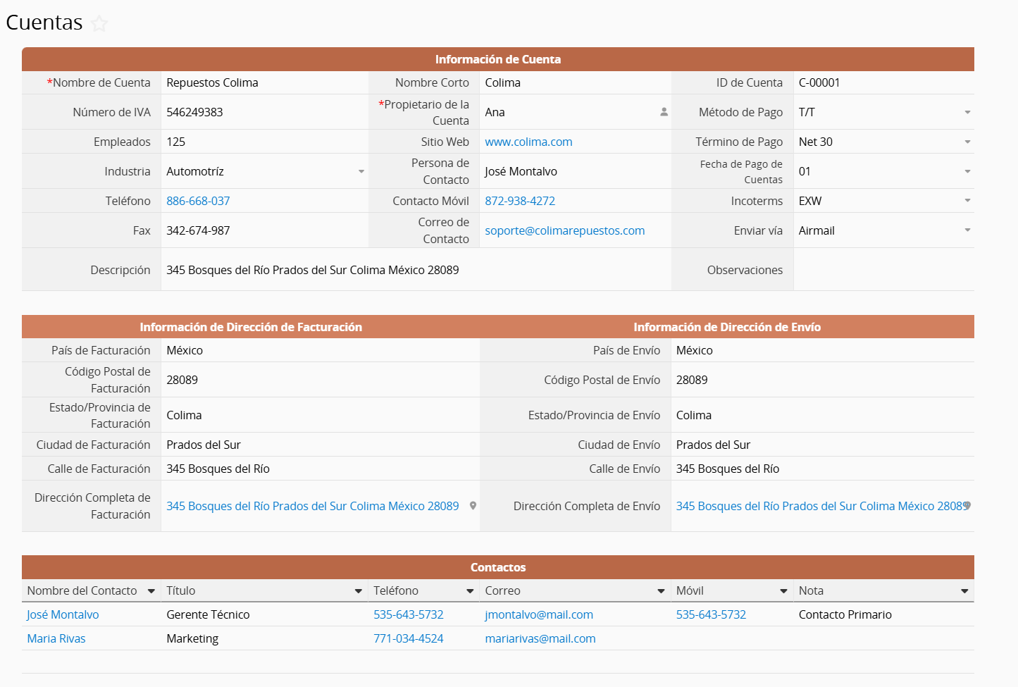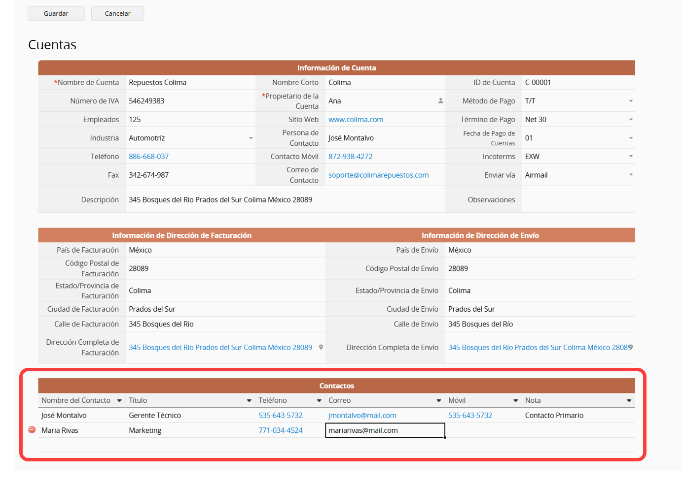 Además de rellenar la información de la persona principal de contacto, también hay una subtabla de Contactos en la parte inferior, que te permite agregar información de múltiples contactos.