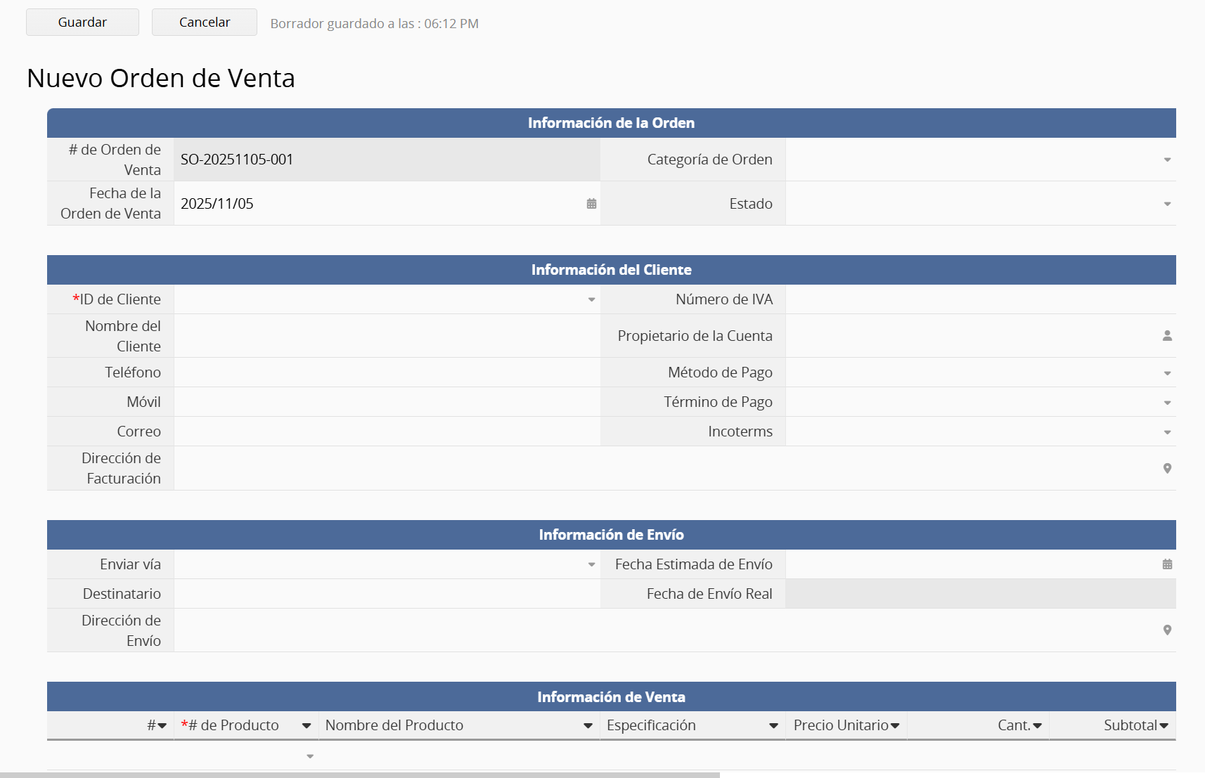 Cuando una orden de ventas es creada manualmente, el # de la Orden de Ventas se mostrará en un campo autogenerarado el cual crea números seriales según la fecha de creación.