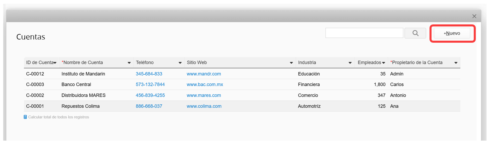Si el cliente es nuevo y su información aún no ha sido agregada a la base de datos, puedes hacer clic en +Nuevo en la parte superior derecha del menú de selección y el sistema te llevará a la hoja Cuentas para agregar la información del cliente. Después de guardar, volverás a la orden de ventas que estabas editando. Los campos relevantes a la información del cliente también se mostrarán automáticamente.