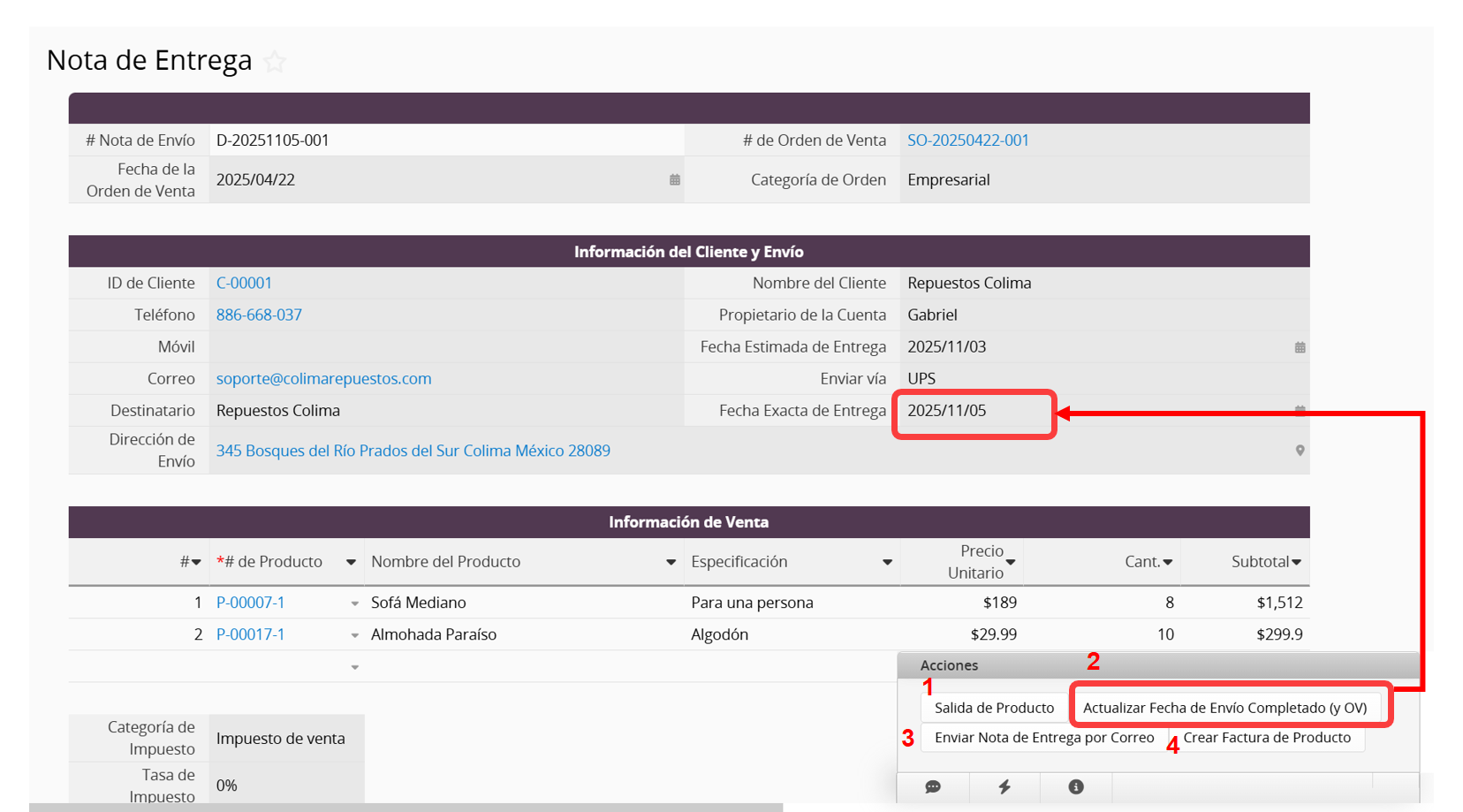 2. Actualizar Fecha de Envío Completado (y OV), esto actualizará la Fecha de Entrega Real en la Nota de Entrega relacionada y los registros de fuente de Orden de Ventas con la fecha de hoy.
