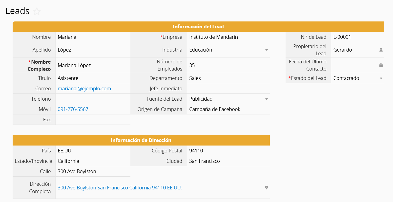 En esta hoja, puedes registrar información sobre las personas que conoces en determinados eventos, personas referidas por tus socios o cualquier que pueda ser un cliente potencial. El nombre del cliente potencial y su empresa/organización afiliada será el asunto de cada registro agregado a la hoja. Además, cada registro incluye el nombre del cliente potencial, empresa y contactos.