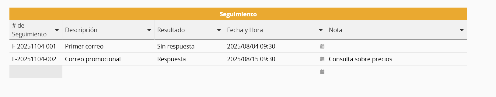 Puedes registrar la información del cliente en la subtabla “Seguimiento”. Desde esta subtabla podrás monitorear cómo cada detalle de seguimiento es tratado en esta etapa. Además, la fórmula aplicada al campo “Último seguimiento” en el formulario principal mostrará la fecha de la actualización más reciente en la subtabla.