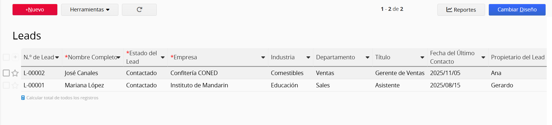 Por defecto, la página de listado de la hoja Leads mostrará los registros filtrados con el estado “abierto” debido a la vista compartida aplicada.