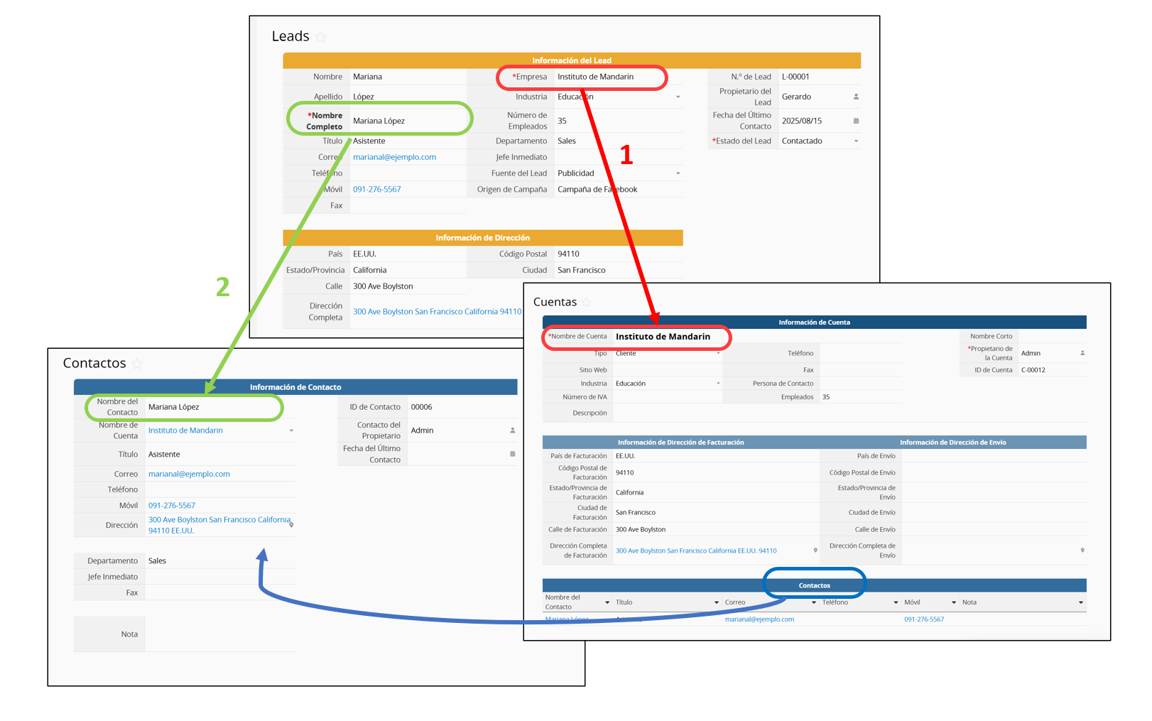 Nota: para asegurar que cada información de contacto sea categorizada y enlazada a la empresa afiliada, el orden correcto de convertir un registro de cliente potencial (Leads) a un Cuenta y Contacto a través de los botones de acción es : (1) “Crear Cuenta” —> (2) “Crear Contacto”.