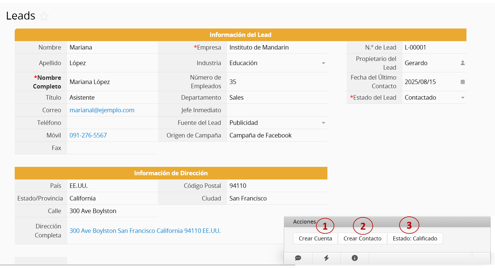 Después de confirmar la información del cliente potencial y convertirlo a cliente Cuenta y Contactos, puedes hacer clic en el botón de acción (3) “Estado de Lead: Calificado” para cambiar el estado del lead, o puedes hacerlo manualmente desde la página de formulario. Esto indicará que el cliente potencial inicial ha sido oficialmente convertido en cliente.