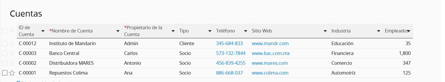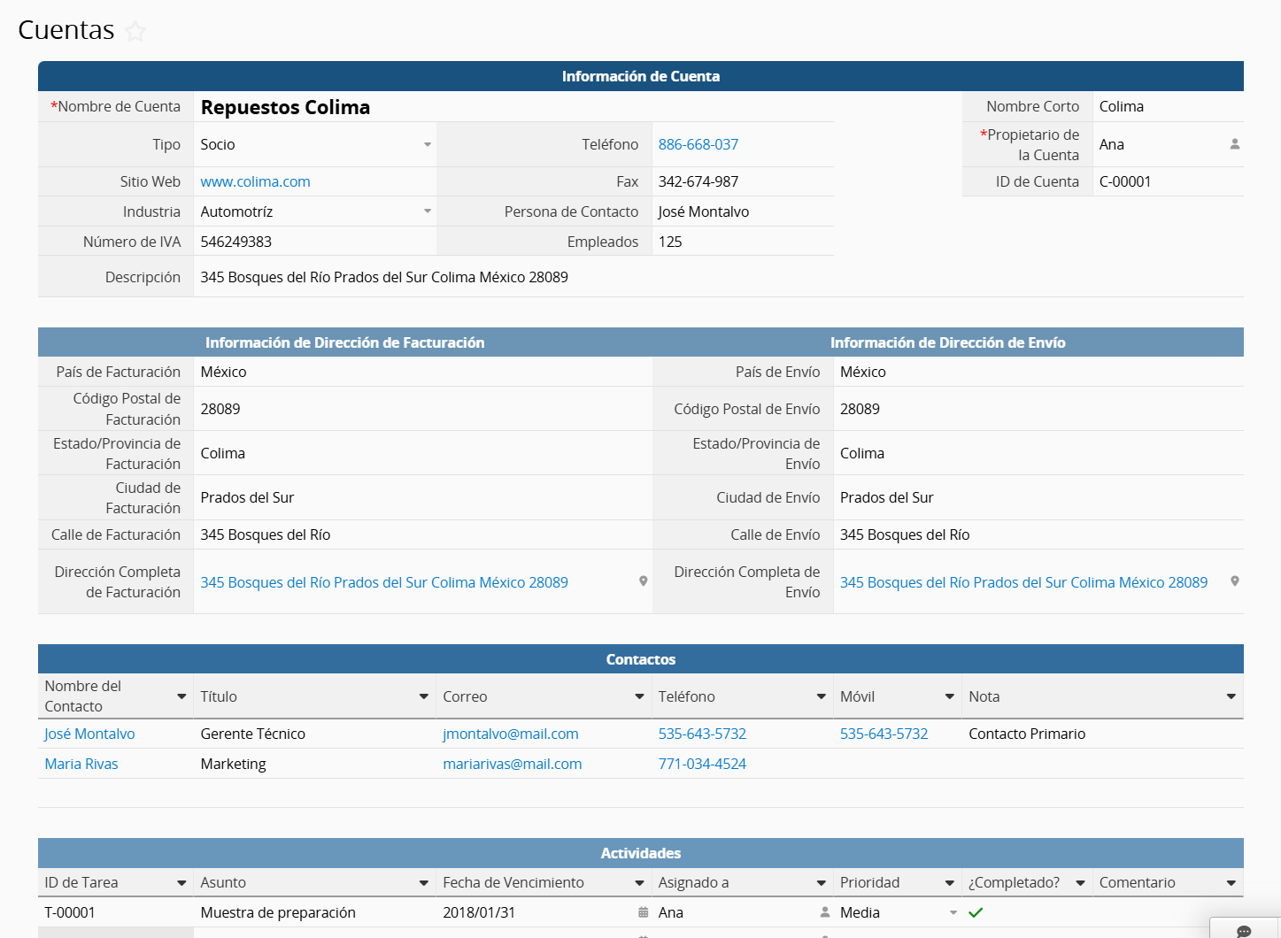 Campos Generales (información de Cuenta y Dirección en la parte superior del formulario) incluyen: Nombre de Cuenta, Número VAT, No de Teléfono, Dirección, Sitio Web, etc., los cuales puedes personalizar y ajustar según los tipos de datos que deseas administrar.