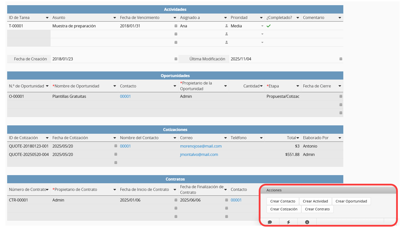 Campos de subtabla (Contactos, Actividades, Oportunidades, Cotizaciones y Contrato): solo registros de subtabla de Contactos y Actividades pueden ser agregados directamente en esta hoja.