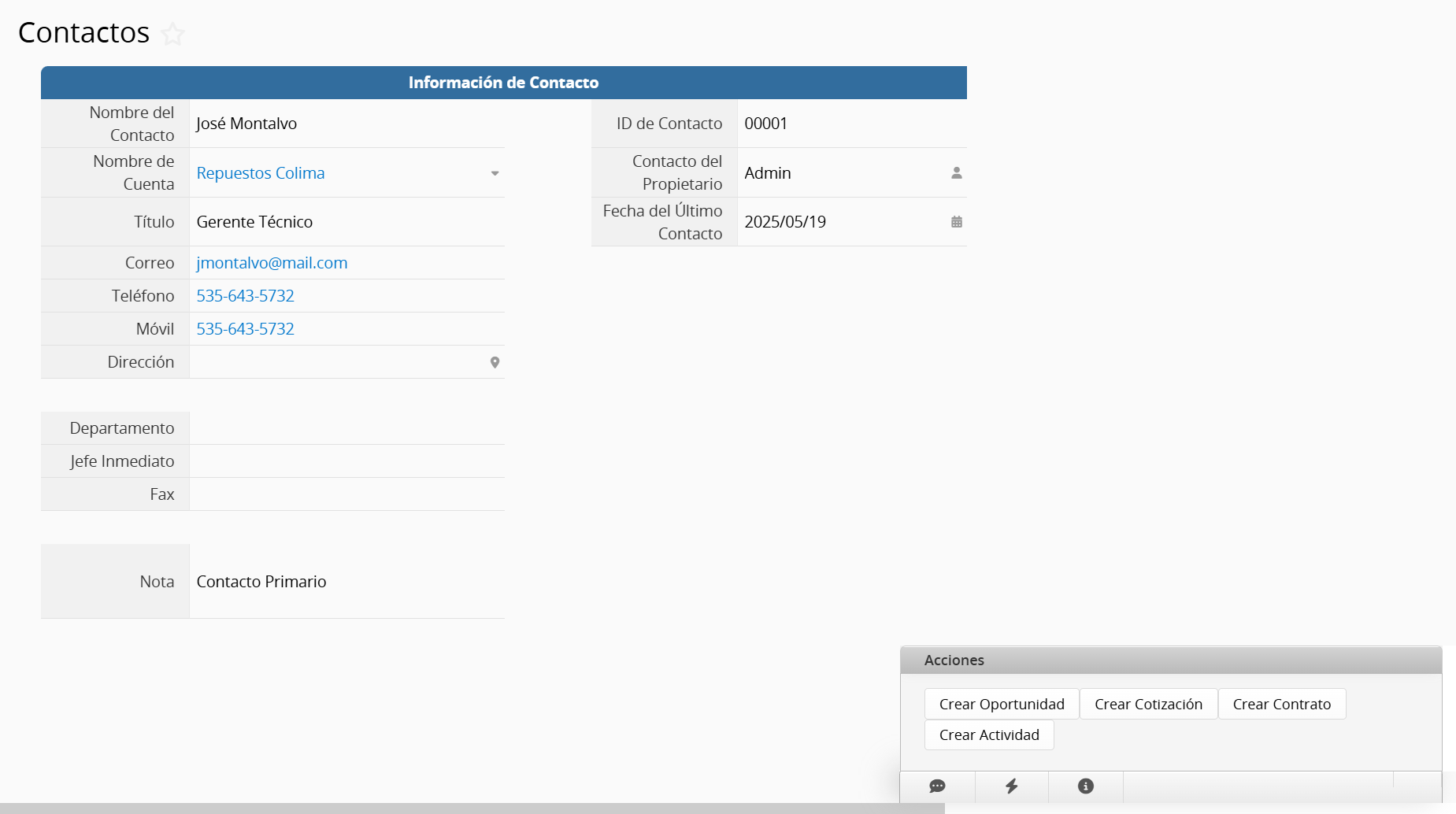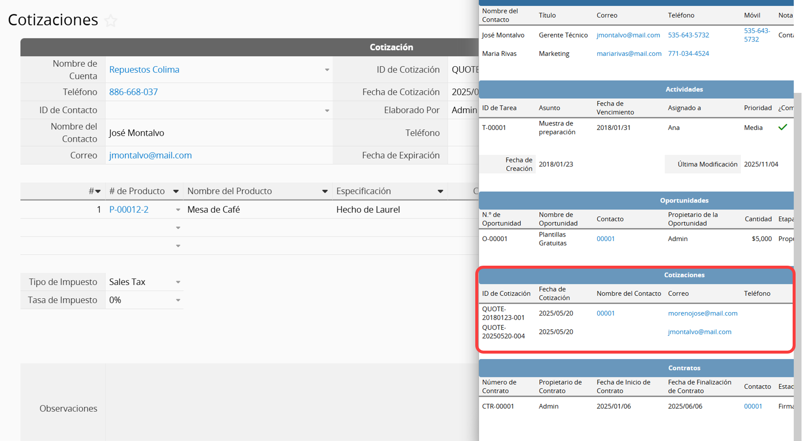 Elije tu objetivo de cotización de ventas desde los campos Empresa y Contacto, los cuales están enlazados a Cuentas y Contactos, respectivamente. Al seleccionar un contacto, otra información tal como No. Teléfono, Fax y Correo automáticamente cargar y rellenar los campos.